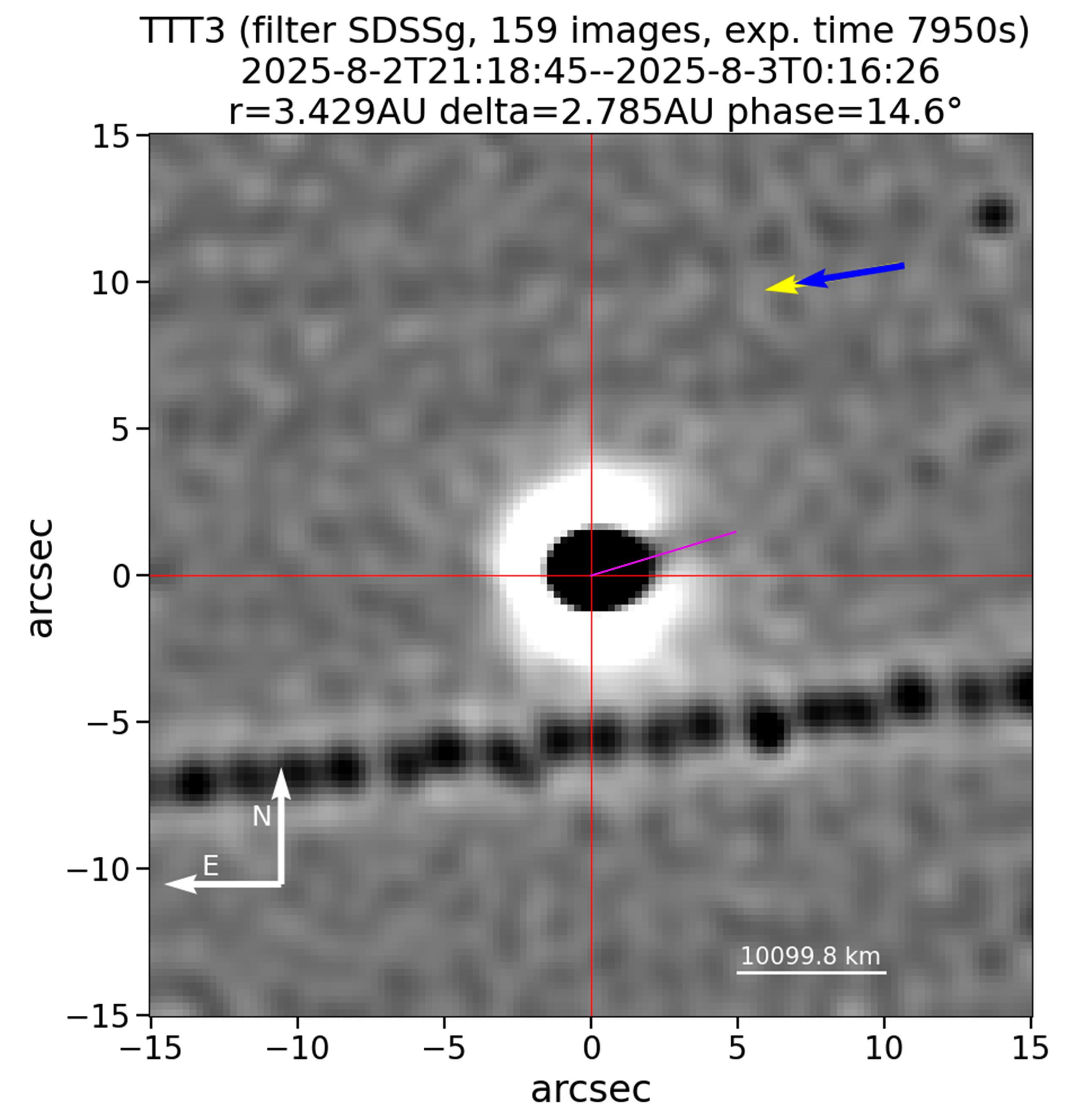 The composite image, created by combining 159 exposures lasting 50 seconds each, shows the icy body (or nucleus) of 3I/ATLAS as a large, black dot surrounded by a white glow. A sudden, fan-shaped break in this glowing ring indicates where a large, high-speed jet of material is blasting off the comet toward the sun. This image was shared on the transient object monitoring site The Astronomer’s Telegram on October 15 but has not yet been published in a peer-reviewed study.